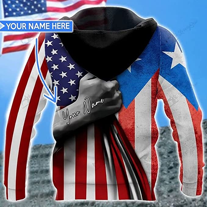 Personalized Name Puerto Rican American Flag American Grown With Puerto Rican Root - 3D Printed Pullover Hoodie. Makes a perfect funny gift for Valentines Day, Christmas Xmas Holidays, Halloween, Thanksgiving Day, Independence Day, Mother's Day, Father's Day, Saint Patricks Day, St Patrick's Day, Black History Month, St Paddy's Day, Birthday, Party, Daily life, Schools, Vacation or Any Occasion... Please order your TShirt a size up if you prefer a loose fitting tee, Also available: T-Shirt Short Sleeve, Long Sleeves Shirts, V-neck Shirt, Tanks, Tank Tops, Hoodie, Sweatshirt.